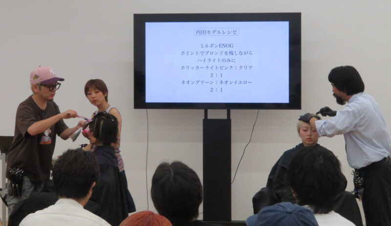 LECO代表の内田聡一郎氏と、内田氏と15年来の仲で右腕でもあるディレクターの小林賢司氏によるスペシャルセミナー。はじめに会社としての軌跡から教育の裏側まで、LECOの強みを徹底解剖しました。また2氏によるカットとカラー剤 ENOGで女性モデルのデモンストレーションを披露。小林氏はパンキッシュをカットベースに、ブロンドヘアに毛先だけイエロー、グリーン、ブラウンを塗布。内田氏はパーマスタイルにレザーを使ってカットし、ハイライトでピンクとグリーンを使用しました。