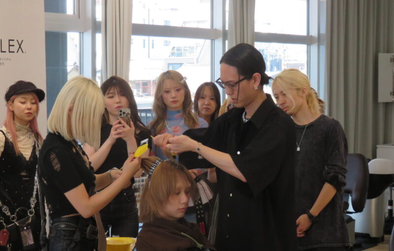 講師はPELE代表のRYUSEI氏。KIRATERAの「Dusty Grey」を使い、残留を生かしたリアルなカラーデザインを披露。RYUSEI氏はリタッチをする際に「常に自分の正面に毛束を持ってくることと、塗るときの手の角度を変えることを大切にしている」と伝えました。過去のイギリス留学の影響から、海外のカルチャーが好きと話すRYUSEI氏は、デザインをつくるときは基本的にヨーロッパの「クラシック」を軸にしていると伝えました。好きで終わらず、なぜ好きなのかを深掘りしてデザインに落とし込むという。