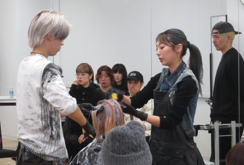 講師はcinq代表の樋口すずの氏とfifth CMOの木村允人氏。樋口氏は”時間生産性”にスポットを当てたブリーチワークの技術展示からcinqの強みである「ワンブリーチ」「ベージュカラー」「チームオーダー」の解説まで行いました。初回の提案フローで2回目3回目の来店を見据えているという樋口氏は「同じ女性として色を抜くことがすべてではない。ダメージしないことが大切」と語りました。木村氏は独自のマーケティング術について説明。fifithの企業成長理論を基に①集客②求人③教育を軸に、今後は人的資本が大切だと受講者に熱く伝えました。