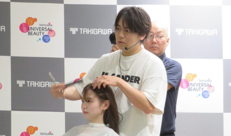 大川氏はモデルへの似合わせをメインとした前髪・顔周りのカット、スタイリングテクニックを披露。骨格の解説から丁寧に技術を教えました