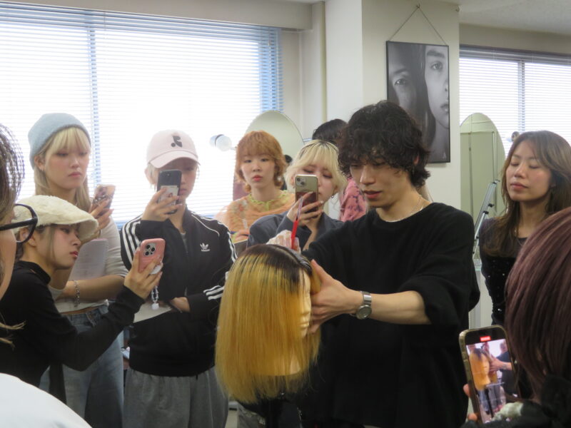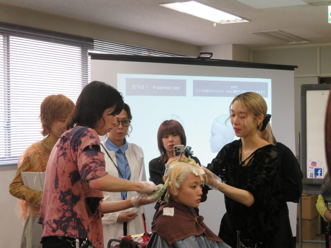 ウィッグで120ブリーチを使ったリタッチ技術を展示する西村氏。午後は希望者のみウィッグ実習を行いました