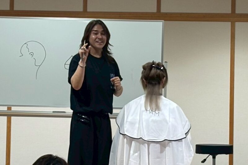 ソウル屈指の高級エリアである狎鴎亭ロデオ通りに店舗を構えるHAUMから、世界各国でセミナー講師を務める代表のハヌン氏が来日。現在韓国で流行している、BLACK PINKジェニーのスタイルを披露しました。ハンモリスタイルをつくるうえで「重さを整えていくことが重要。少しずつカットして、量を確認するという工程を繰り返すことでキレイなラインができてくる」と解説。また常に髪全体を触って量を確認しながらカットすることが大事だとハヌン氏は語った。またスタイルづくりで重要なブラシの使い方や、前髪カットのレクチャーも行われました。