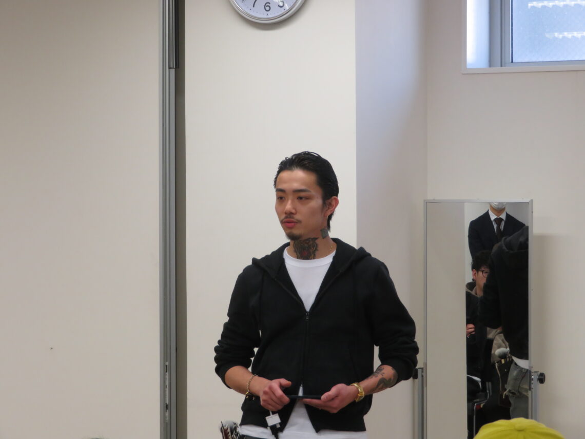 新規客の8割がメンズというALBUMディレクターの翼氏を講師に迎え、似合わせやカウンセリングについてのポイント解説と、ツイストピンパーマスタイルのモデルデモが行われました。カウンセリングについては「写真でイメージ共有や悩みをヒアリングしてから、お客さまの日々のスタイリングなどを汲み取っていき、なりたい姿と、美容師のこだわりをかけ合わせたスタイルを打ち出している」と翼氏。ほかにもSNSを利用したブランディングや、メンズに特化したい美容師に向けたさまざまなノウハウを伝えました。