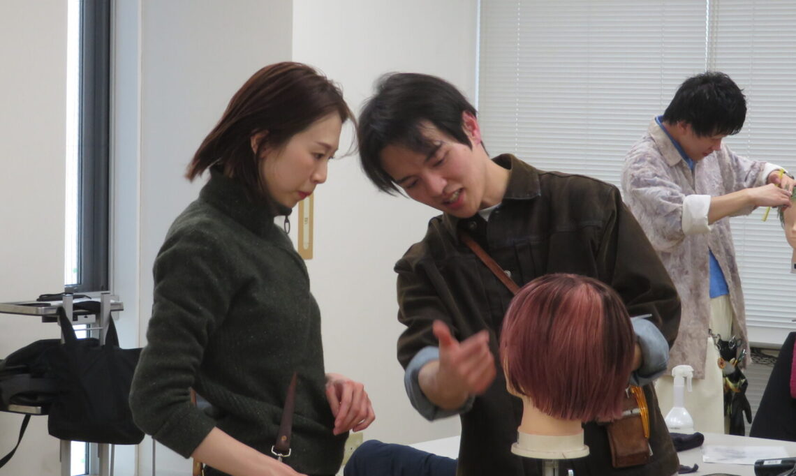受講者は事前にカラーを仕込んだ状態のウィッグで実践。一人ひとりに声をかけながら、寄り添ったサポートをする椿倉氏