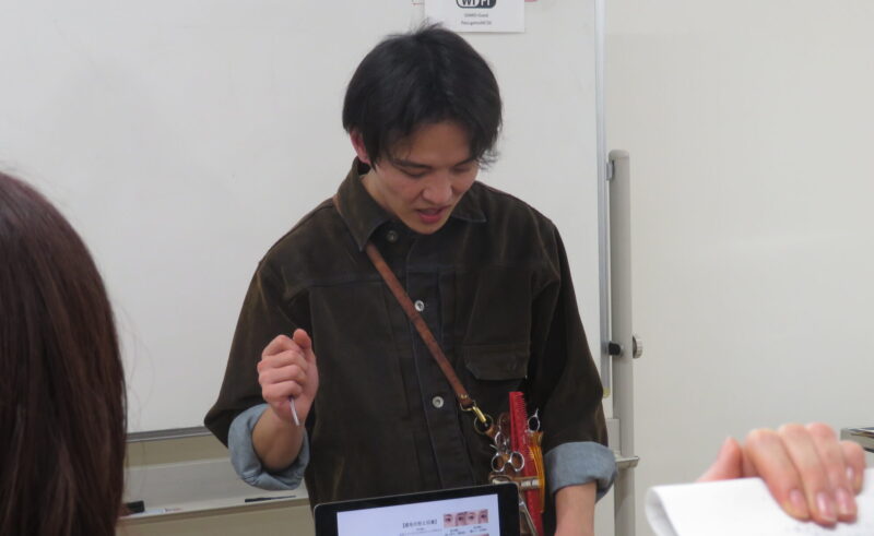 講師はTLACE.代表の椿倉章吾氏。2025年10月27日に行われた【レクチャーとデザインワークを通してデザインについて学ぶ】のフィードバックから始まり、ブラッシュアップのためのアドバイス、実際のコンテストを想定した時間制限つきの実践へと進みました。実践後は、「長短はつけた方が良いが、ディスコネは使いすぎるのはNG。なるべくつながって見えるように」とアドバイス。メンズはディスコネを入れすぎる傾向に、レディースは入れない傾向にあることも発信。コンテストで勝つにはとにかく「攻めて!カット!!」と力強く伝えました。