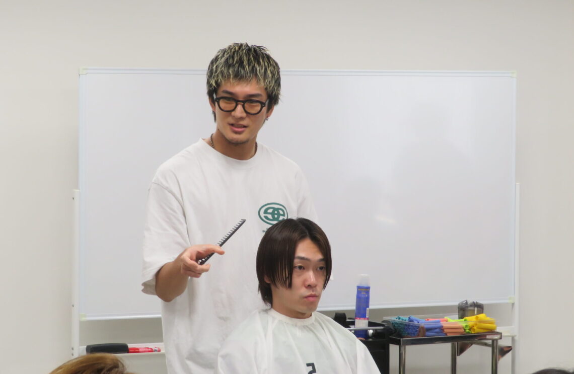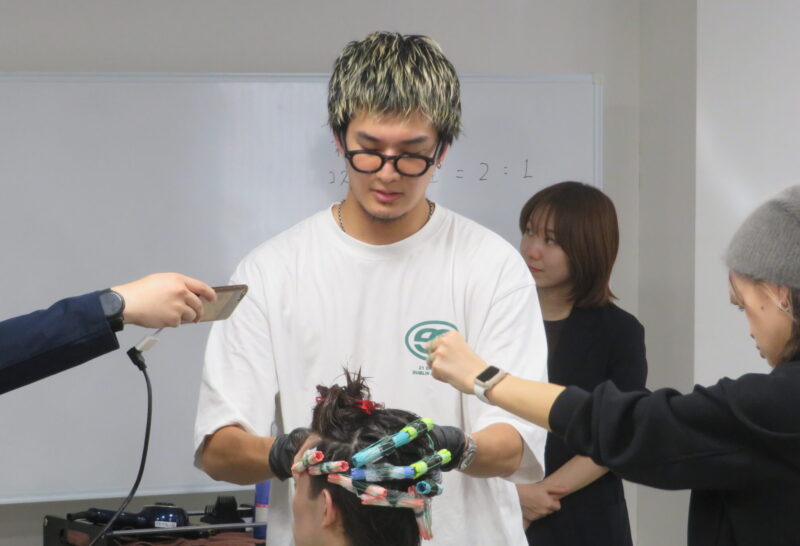 講師はスタイリストデビュー5カ月で平均売上350万円を達成したfifthの橋本龍星氏。HITAを使用したクリームパーマでつくるシャドウパーマスタイルを技術展示した。パーマで一番重要なのはカットだと話す橋本氏は、カウンセリングの時点で顧客の髪質に対する施術方法を可視化するという。パーマについて「室内温度によってかかり具合が変わってしまうのでエアコンには注意している」と話しました。「今回は根元まで動きはいらないので、毛先から中間のみに薬剤をつけ、強調したい箇所は2回ねじって巻く」とポイントも伝えました。