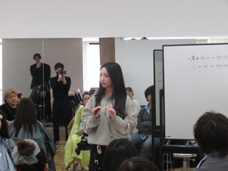 「チャンモリ」とは”産毛“を指し、生え際を産毛量にカットして固定したものが「チャンモリパーマ」。PELE UMEDA代表のmiyu氏が講師を務め、日本人の骨格や顔立ちに合わせた独自の「チャンモリパーマ」をモデルデモンストレーション。「ポイントは”多すぎない産毛の量”。おでこは生え際の1mmしか取らない」とこだわりの技術を受講者にみせました。チャンモリパーマ+産毛のカットを¥10,000でメニュー展開しているPELE。「チャンモリパーマ」をやっていないサロンが多いからこそ、いまこの値段で勝負していると語りました。