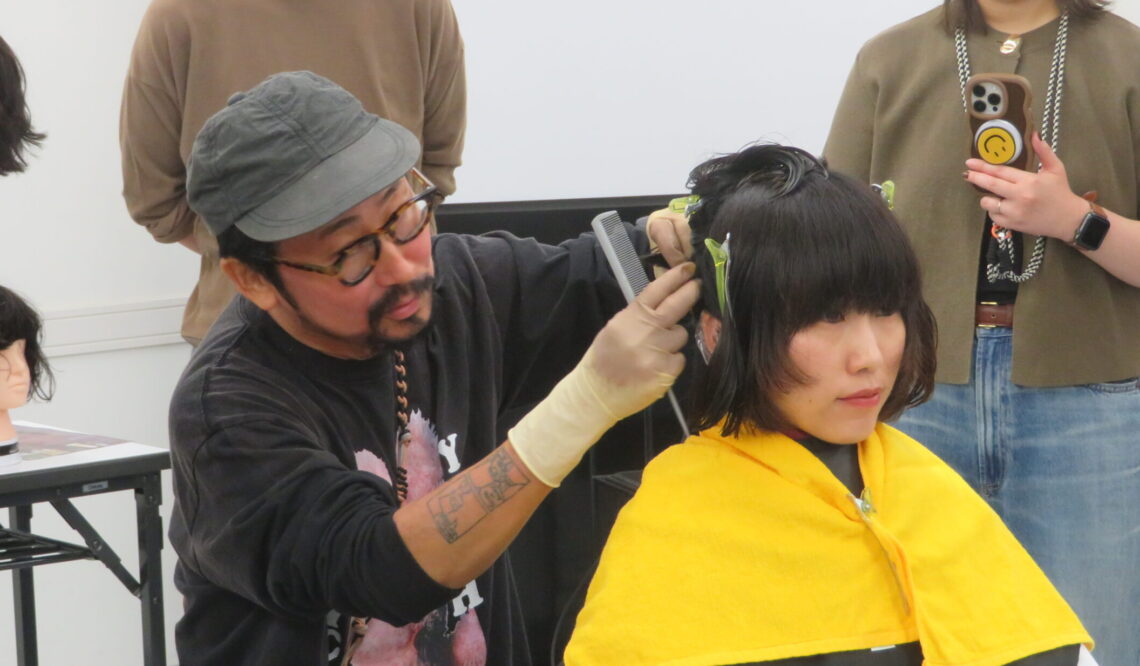 レイヤースタイルをつくったナルセ氏は「あまりウェーブ感を出したくないので、顔周りは軽くしすぎない」とこだわりあるカット術をみせました