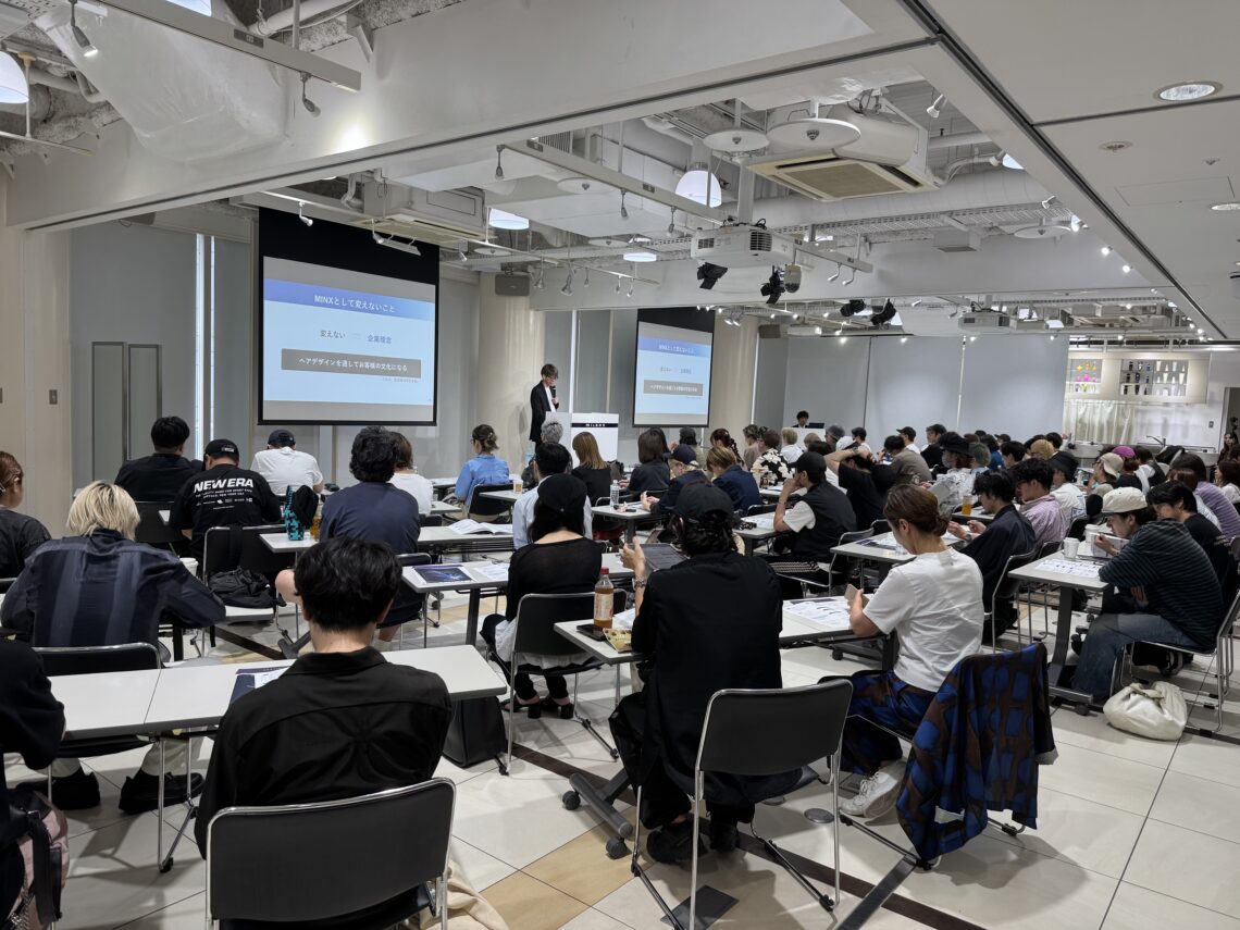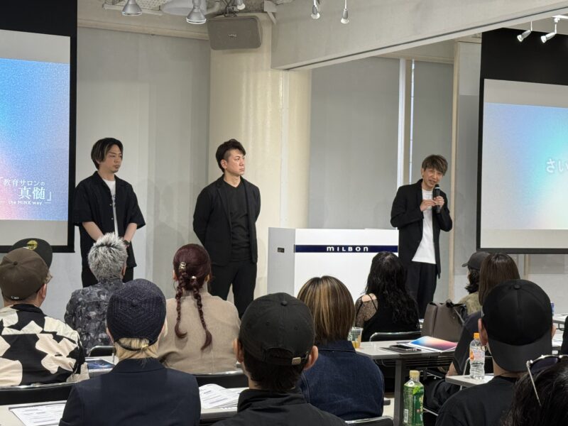 (株)MINX world社長の岡村享央氏、同取締役の菅野久幸氏、MINX aoyama代表の清水豊氏が、生涯美容師を実現する仕組みなどの人材育成術を公開しました。まず岡村氏が、理念を軸に経営、運営、教育を行うための永久顧客化、スタッフの生涯美容師化、終身雇用の3つの目標を具体的に説明。次いで菅野氏が、「時代の教育傾向から、共感で導き、個性を開花させ、世代を超えた共創を行っている」と人材育成について提言。清水氏は技術力をSNS集客につなげた取り組みを紹介し、「新規獲得のためのSNS。結果が出るまでスタッフを応援すること」と伝えました。